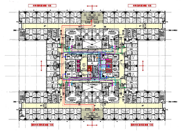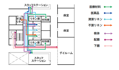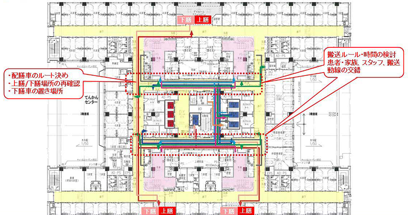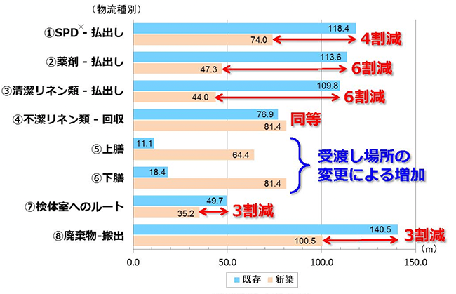 約450床、延べ床面積約2万5,000㎡規模のスポーツベット サポートにおいて、建て替え時に「サプライくん」を活用。シミュレーション結果に基づき、移動頻度の高い部屋の近接配置、搬送スケジュールや業務分担の見直しを行った結果、物流動線の合計距離は、現状と比較して3割以上短縮しました。