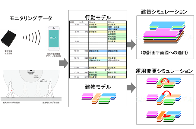 本調査により、対象者一人ひとりの動線量や歩行速度、通路の通行頻度、エレベータ待ち時間など、場所の使われ方に関するさまざまな分析を行うことができます。