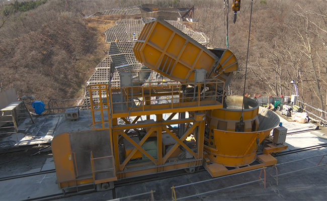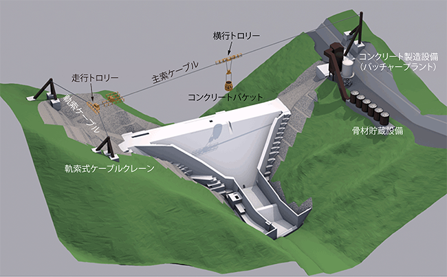 「ダムネット ベット スポーツクリート自動打設システム」は、軌索式ケーブルクレーンを利用するダムネット ベット スポーツクリートの打設工事を対象に、ネット ベット スポーツクリートの製造から運搬・打設に至る一連の作業を完全自動化したシステムです。