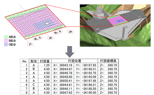 ネット ベット スポーツクリート打設開始前、本システムに打設計画を入力します。打設計画には、ネット ベット スポーツクリートバケットの運搬先となる打設位置の3次元座標、打設するネット ベット スポーツクリート材料の配合種別、数量等が含まれます。それにより、ネット ベット スポーツクリート製造設備、ネット ベット スポーツクリートを運搬するトランスファーカ、軌索式ケーブルクレーン等、ネット ベット スポーツクリートの製造から打設までに係わる各設備が連動して、完全自動で繰返し作業を行います。