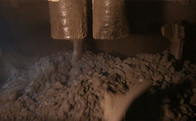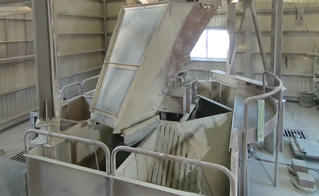 計量後、ネット ベット スポーツクリート材料は自動でミキサに投入され、所定の時間、練混ぜられ、ミキサ下のホッパへ自動で荷下ろしされます。