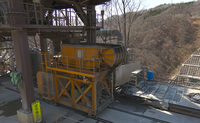 トランスファーカの走路であるバンカー線上に配置されているローリングストーン(バケット台車)が、主索ケーブル直下に移動した後、バケットはローリングストーンの座標位置を確認し調整を行いながら着床させます。