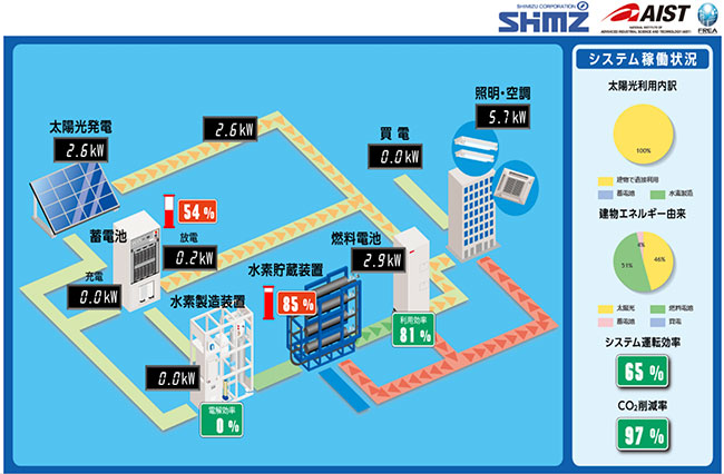2017年6月から2019年3月にかけて、国立研究開発法人産業技術総合研究所の福島再生可能エネルギー研究所(FREA)内で、システムの性能を検証するとともに、シミズ・スマートBEMSによる最適な制御技術の確立を目指すため、本格的に実証運転を行いました。