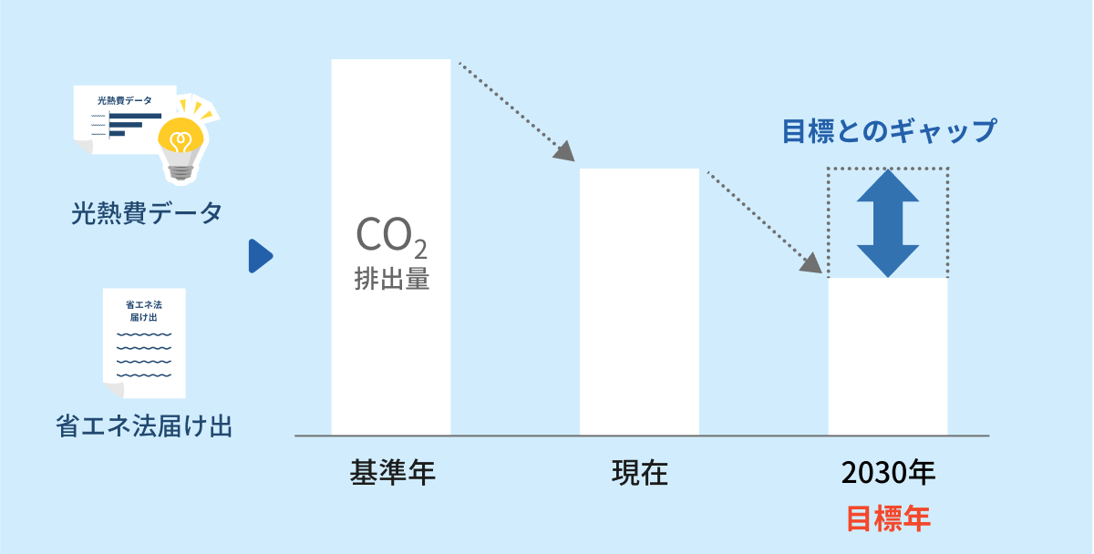 光熱費データや省エネ法の届け出などをもとに、現在の総CO2排出量と2030年に達成すべき目標排出量との差(ギャップ)を明確にします。個々の建物のCO2排出量だけでなく、まずは全体像を俯瞰して把握することで、目標達成に向けた取り組み方針を定めることができます。