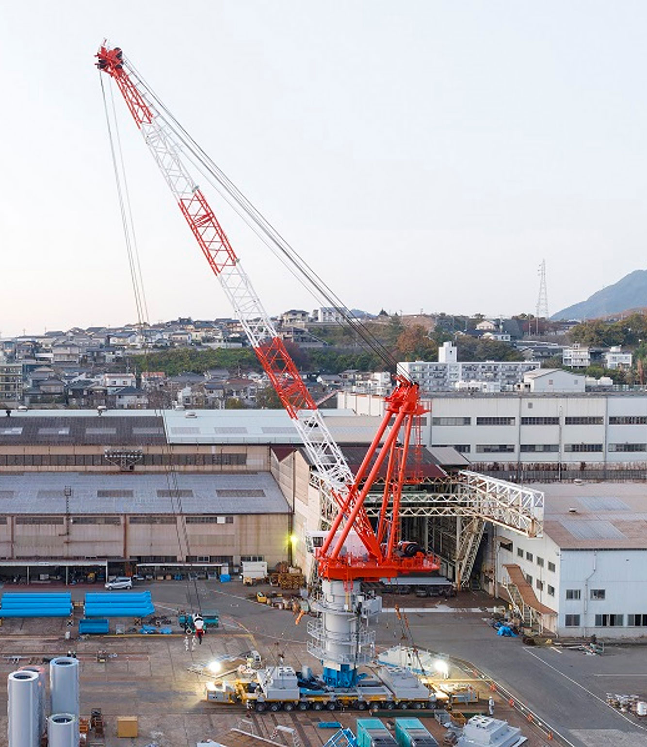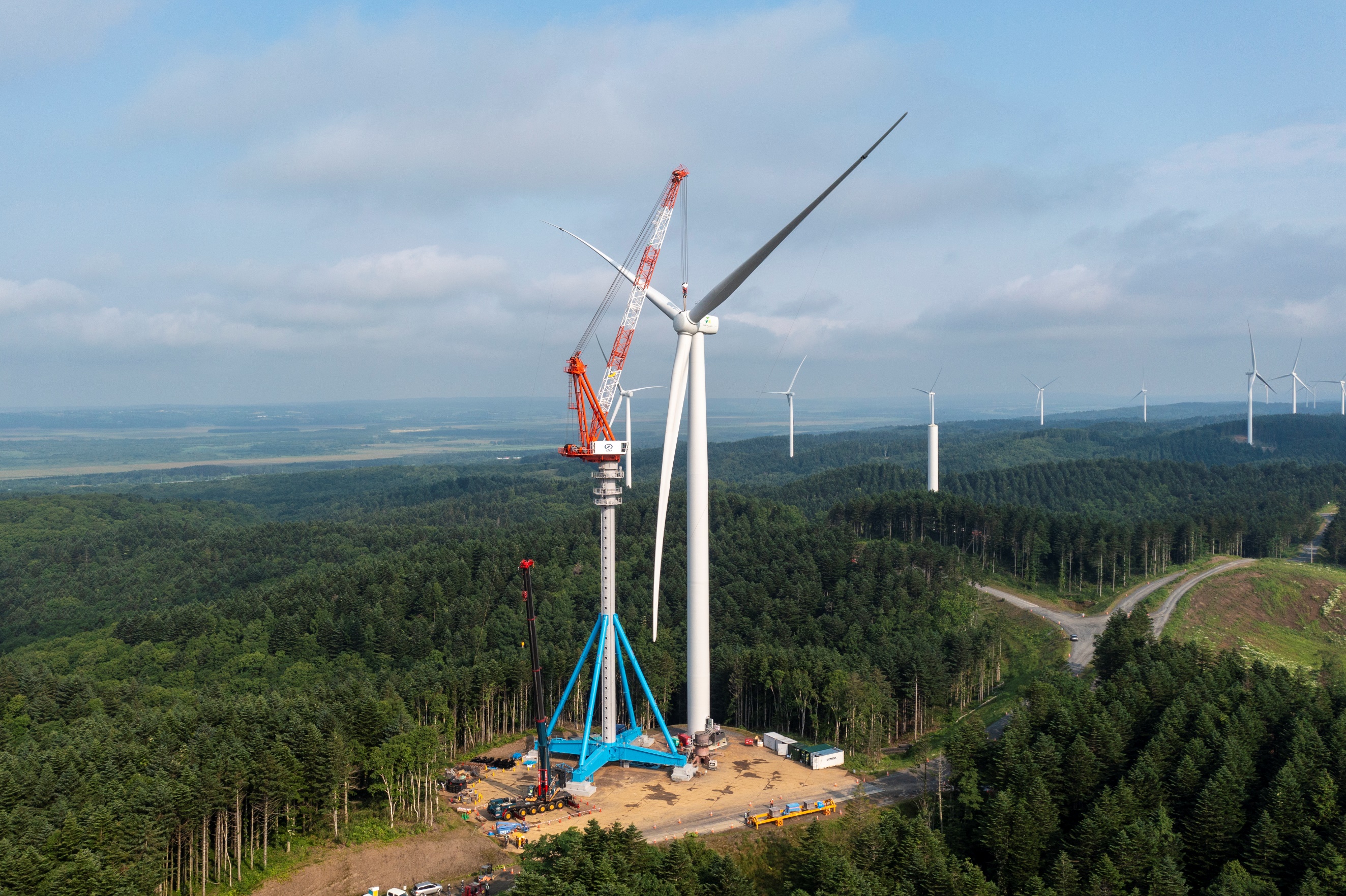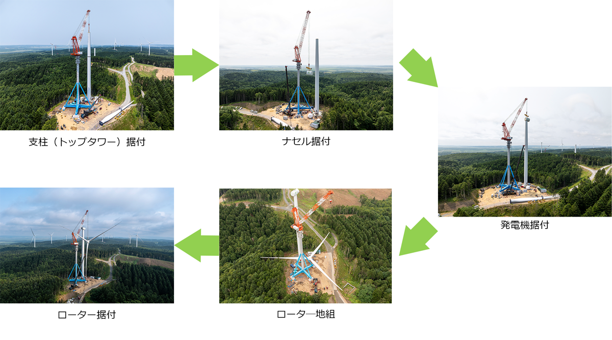 当社が開発した「S-Movable Towercrane(エスムーバブルタワークレーン、SMTC)」は、大型陸上スポーツベット 入金不要の建設に対応可能な移動式タワークレーンです。作業可能な高さは最高152m、揚重能力は最大145tと自立式タワークレーンでは国内最大・最高性能を誇り、6~7MWクラスの大型陸上スポーツベット 入金不要を効率良く建設することができます。2023年に完成し、各種試験などを経て、24年には国内最大級の陸上風力発電プロジェクト「芦川ウインドファーム(WF)」(北海道)の南側区画に適用。4.3MWスポーツベット 入金不要を施工しました。設置したスポーツベット 入金不要は、支柱の高さ85.0m、ブレード(羽根)の長さ60m、ブレードの最高到達点145mです。1基目のスポーツベット 入金不要施工では、部材の荷下ろしから支柱の建て方、ブレードとローター(スポーツベット 入金不要の回転部)の地組(地上での事前組み立て)、ブレードを取り付けたローターの揚重・組み立てに至る一連の作業を4日で完了し、想定通りの施工性を発揮しました。