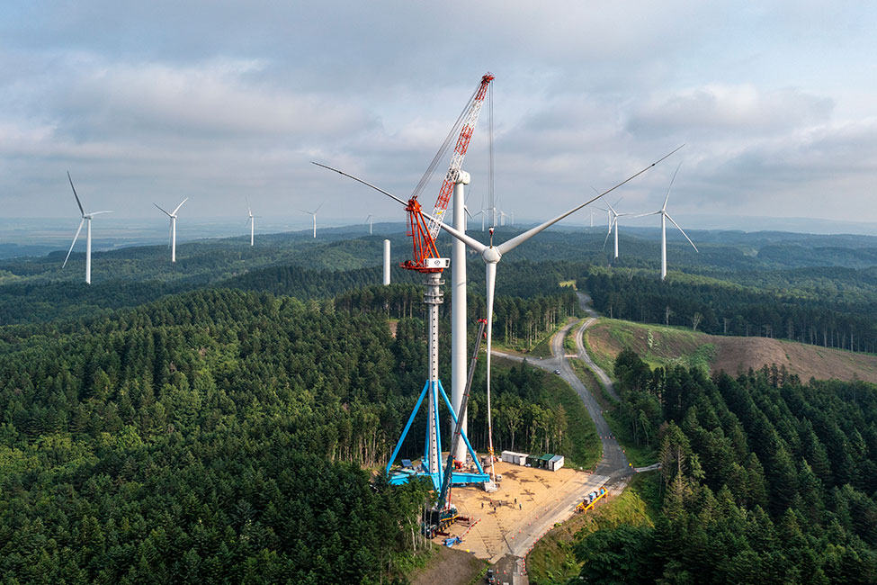 昼夜を問わず風の力で発電する陸上風力発電。再生可能エネルギーの需要拡大に伴い、その需要はますます加速する見込みです。中でも、発電効率が良い大型スポーツベット 入金不要の市場投入が予想されており、当社はスポーツベット 入金不要の大型化に対応すべく、国内最大の陸上スポーツベット 入金不要建設用のタワークレーンを開発しました。