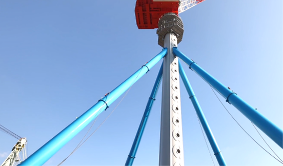 マストステーの設置により、揚重作業時及び強風時のマストの変形を低減し、安定性と安全性が向上しています。さらには、組み立てや解体に要する時間を短縮させるため、マストとマストステーの接続部にはピン構造を採用しました。一般的には組み立て・解体時に、マストステーを固定させるために外部高所での作業を伴い、危険度が増しますが、SMTCは内部から安全に固定できます。