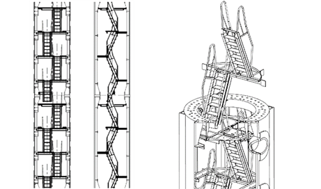 SMTCには、円筒形マストを採用しました。円筒形状の風力係数は0.7で、従来の矩形トラス形状の1.6と比べ、風圧の影響を低減。クレーンが風から受ける荷重を小さくすることで、マストの変形と揺れを緩和して、安定した施工を実現します。通常マスト内の昇降設備は、はしごが一般的ですが、オペレータの負担軽減のために階段を採用しました。
