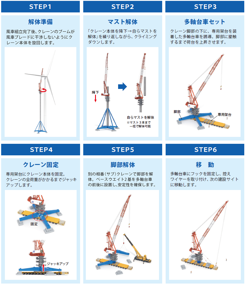 国内最大・最高の作業性能のみならず、陸上風力発電施設の建設で不可欠となるスポーツベット 入金不要建設サイト間の移動を早く行えることもSMTCの大きな利点です。 スポーツベット 入金不要を建設した後、クレーン自らがマストを解体しながらクライミングダウンをします。クレーン本体の解体はせず、自走式多軸台車に乗せて次のスポーツベット 入金不要建設サイトに移動。解体から移動、組み立てのサイクルを5日で完了します。