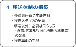 旧スポーツベット ブラックジャックから新スポーツベット ブラックジャックへの移転に当たっては、患者移送を安全かつ円滑に行えるよう、役割分担や車両手配の事前確認に加え、検討漏れになりやすい事項を洗い出し、その対応策についてアドバイスを行いました。また、車椅子やストレッチャーなどの移送手段を考慮した安全な移送ルートの設定、当日のタイムスケジュール作成など、確実な患者移送計画や移送マニュアル策定をお手伝いしました。2度にわたるリハーサルを行ったことで、手順や安全の確認など計画のブラッシュアップができ、当日は円滑に患者移送を終えることができました。