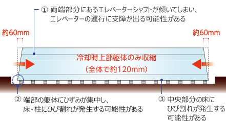 建物を3分割し、冷却後に緊結するという方法で最大のネックであった鉄骨の熱収縮問題を解決した