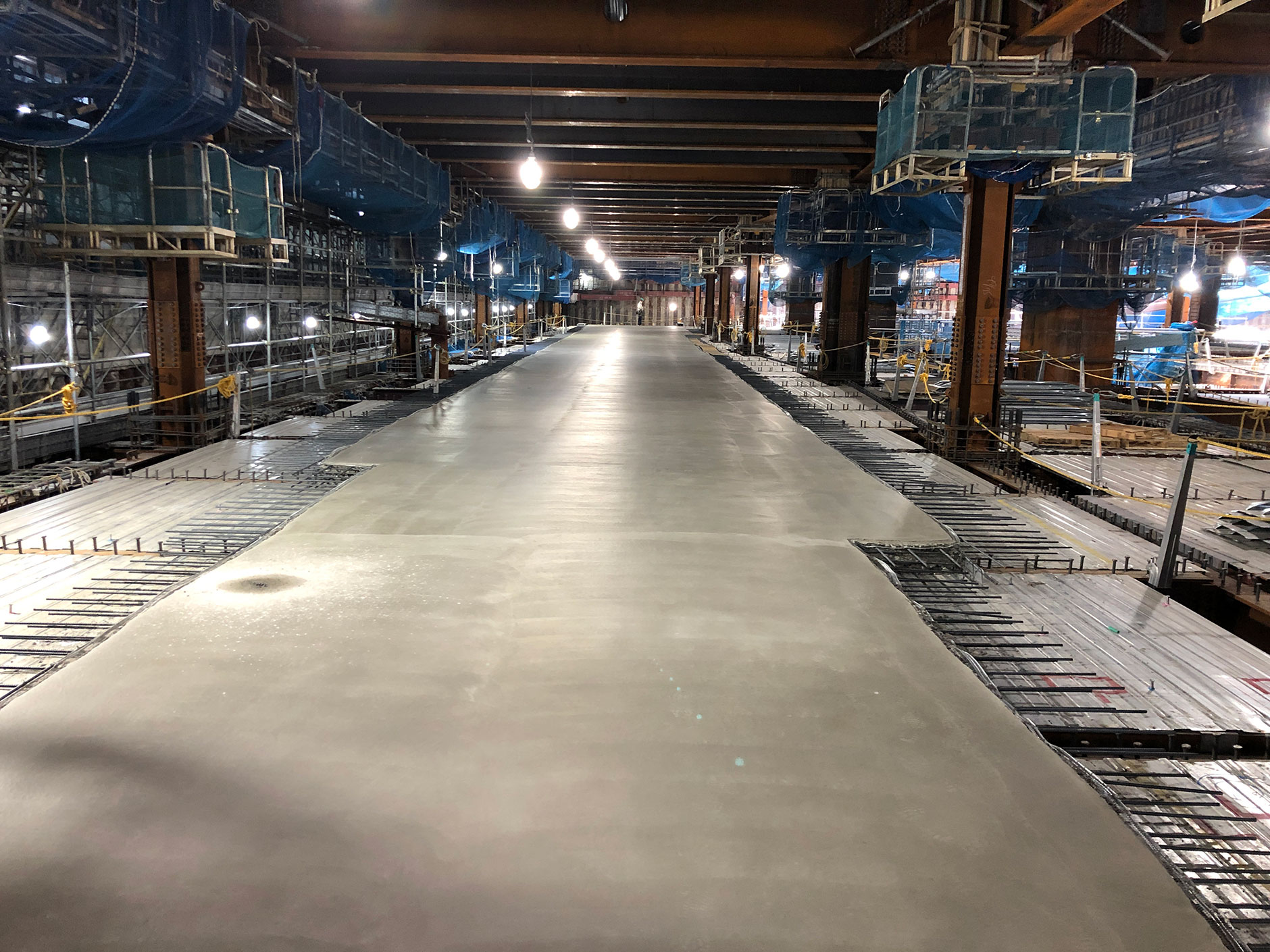 本工事では、地下部の掘削完了後、地上1階の床を先に構築し、そこから地下と地上の躯体工事を並行して進める二段打ち工法を採用しました。仮設計画における工夫について、八木は次のように語ります。「今回新たな試みとして、地下1、2階でも床を一部先行して施工しました。台車の横移動が可能となり、従来と比べて資材運搬の時間が短縮。作業性が格段に向上し、作業員からも絶賛されました。工程管理もより確実になり、非常に画期的でした」。この資材用の床は、アイデアマンの担当工事長の提案を採用したものです。八木は「和と知恵」を大事にすることをモットーに、所員とコミュニケーションを取り、各自の知恵や発案を尊重するよう心掛けています。当現場での利点に加え、後進の知見蓄積や成長につなげたいと未来を見据えます。