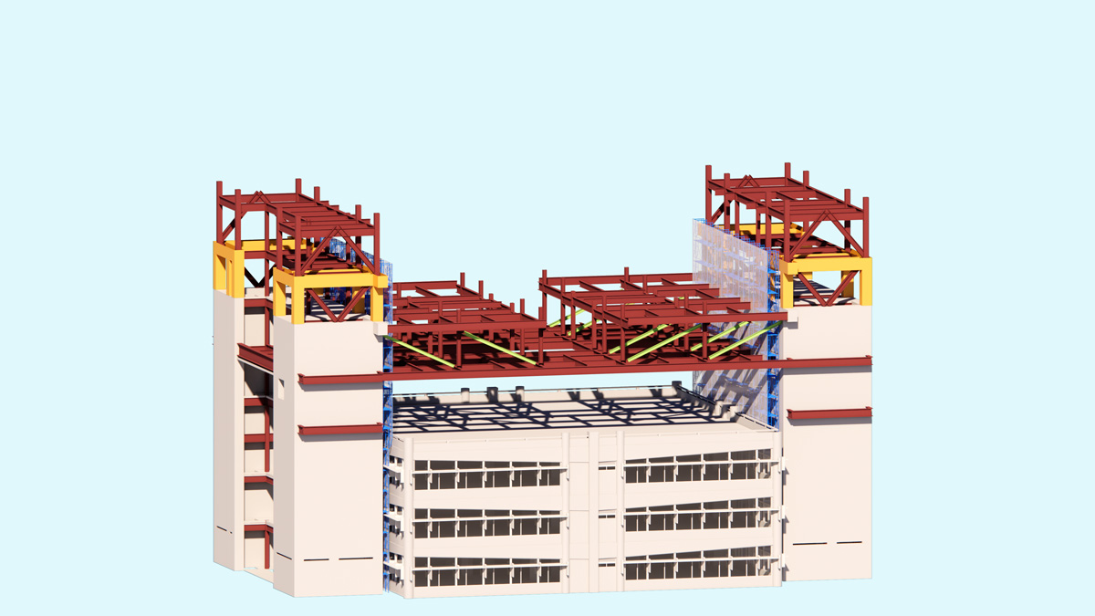 ・両サイドのSRC造躯体を構築している途中の段階で、スポーツベット サポート52号館上部の鉄骨建方を5、6階梁から開始