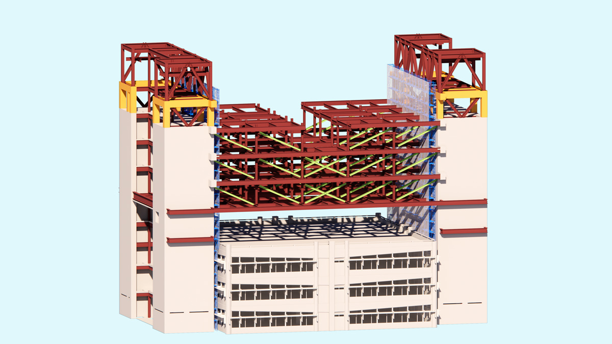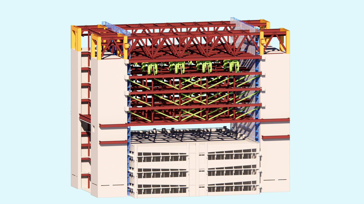 ・頂部メガトラス鉄骨受けとして、8階梁にジャッキ架台を設置 ・頂部メガトラスト鉄骨を、ジャッキ架台を介して仮設補強をした下階鉄骨で受けて組み立て ・本締後にジャッキダウンしてメガトラスを自立