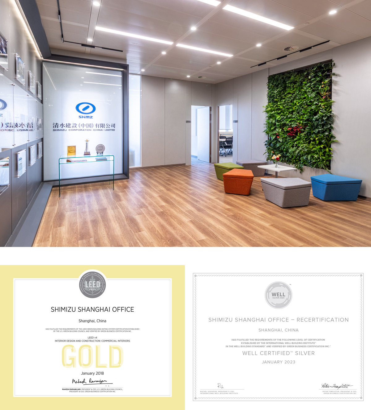 清水中国社は、新上海オフィスの内装でLEED v4「ゴールド」(2018年1月)とWELL v1「シルバー」(2018年7月)を取得しました。WELL認証の取得は中国で6事例目、スポーツベットにとっては世界で初の快挙となりました。(2023年1月 WELL v1「シルバー」再認証)