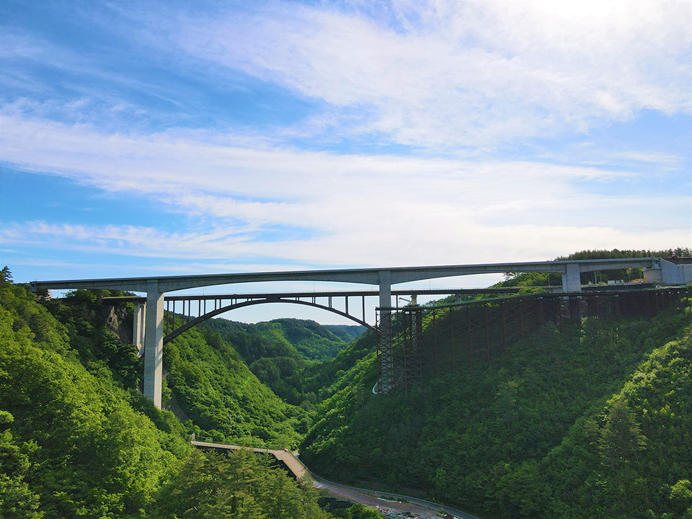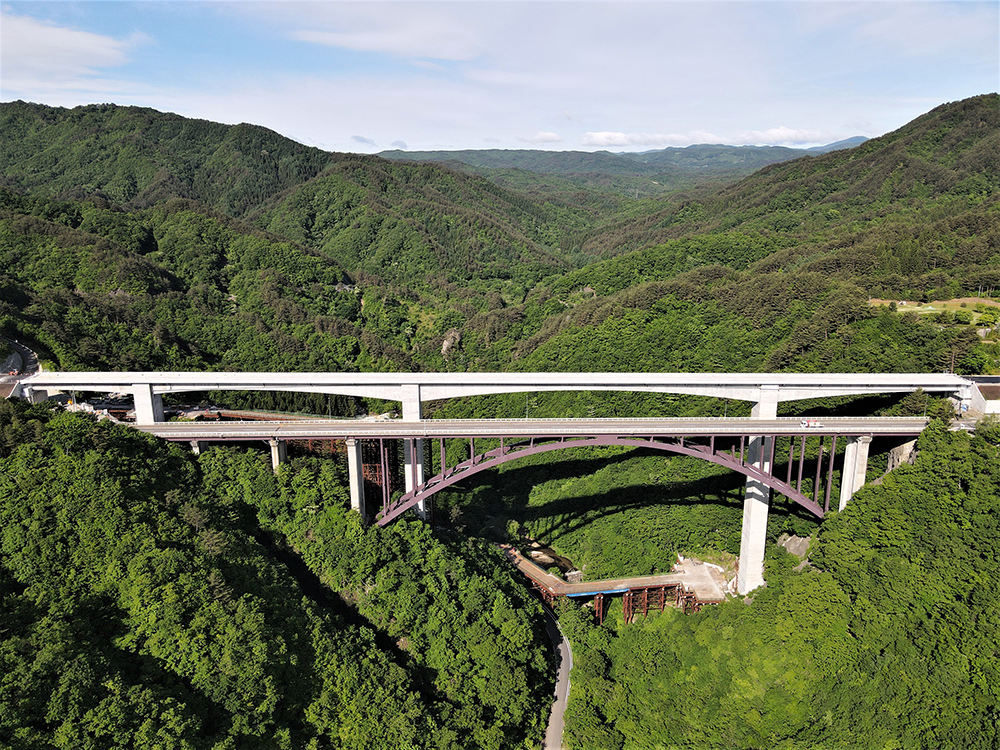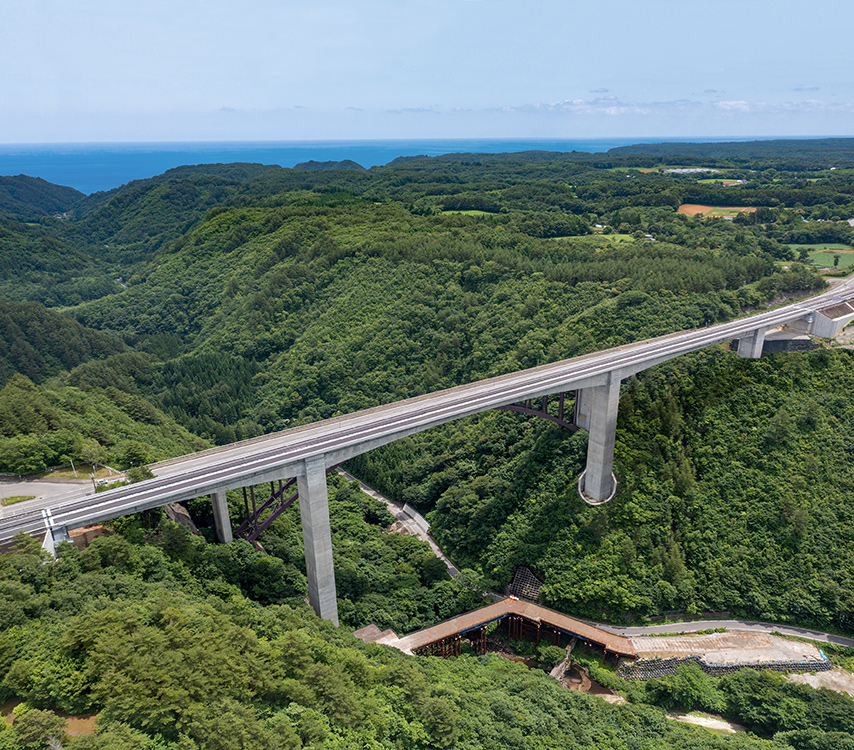 東日本大震災の復興道路として計画。谷底から路面まで約130m、橋脚高93m、支間長150mの国内最大級の橋をスポーツ ベット 投資しました。大型架設作業車、PCa製品の採用などで工程短縮の要望に応えました。