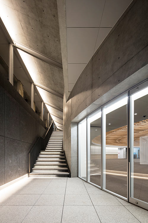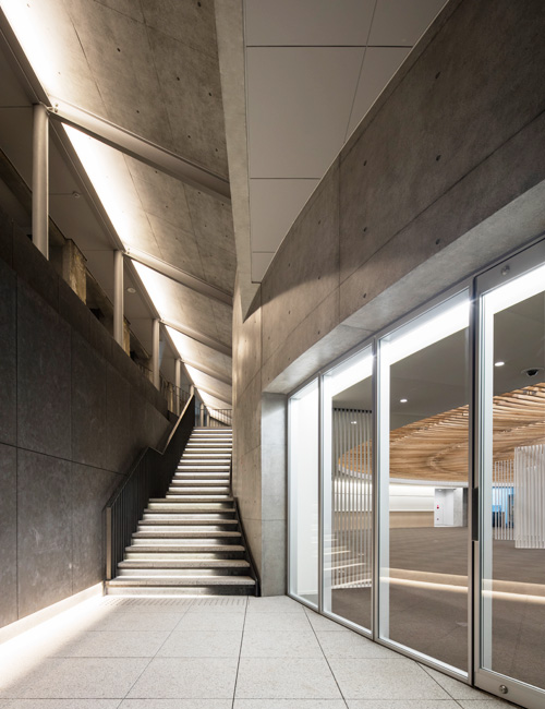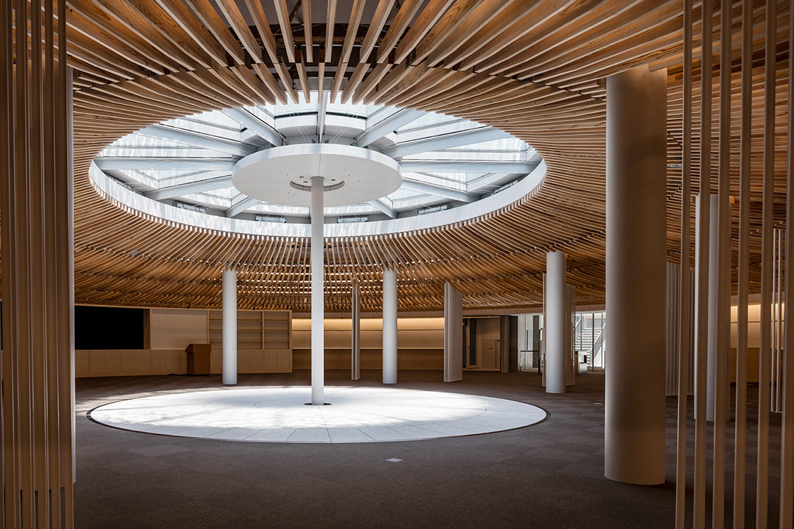 地下建築物やドライエリアに面した出入口、上噴トップライトに二重三重の浸水対策を講じました。ライブラリープラザに輻射パネル、全面床吹出し空調、天井木格子を用いて空間の快適性を高め、人と本にやさしい建物をつくりました。