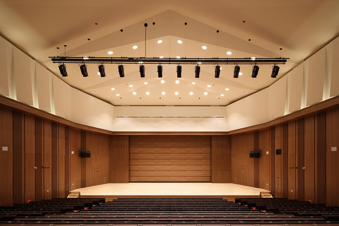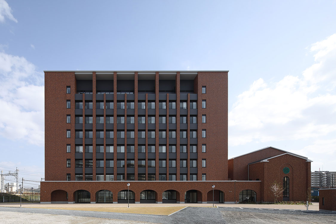 新学部設置に伴う新校舎のスポーツベット 着いたー。躯体精度を重点的に管理し、タイルを基調とした外装を美しく仕上げました。ホールの音響品質確保などの課題を設計事務所や社内スタッフと連携して解決し、高品質の建物を完成させました。