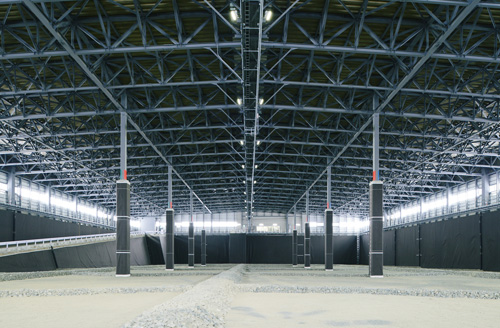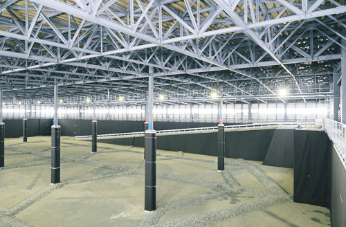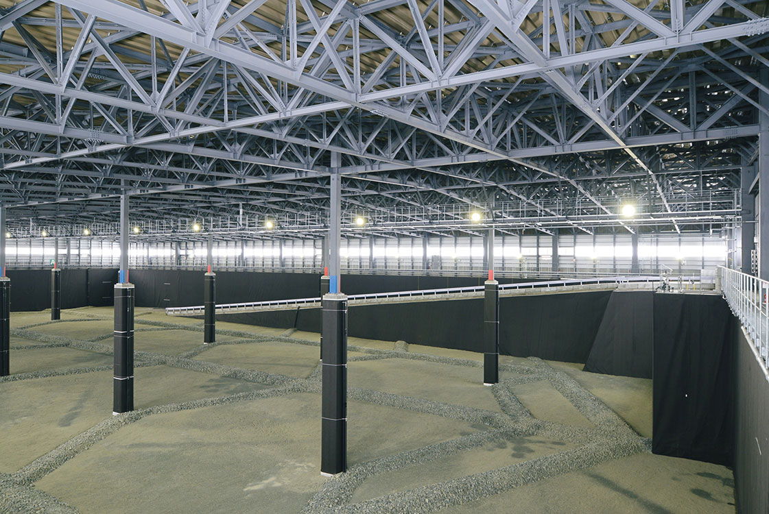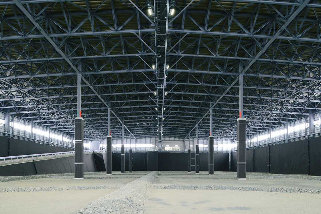 120m×75mの平面を有するクローズド型一般廃スポーツベット サッカー 夏処理場。運用時の作業効率を高めるため、積雪2mの豪雪地帯で柱スパン25m×20mの大空間を実現。基礎・遮水構造などを土木、上屋を建築が担当し建土JVで取り組みました。