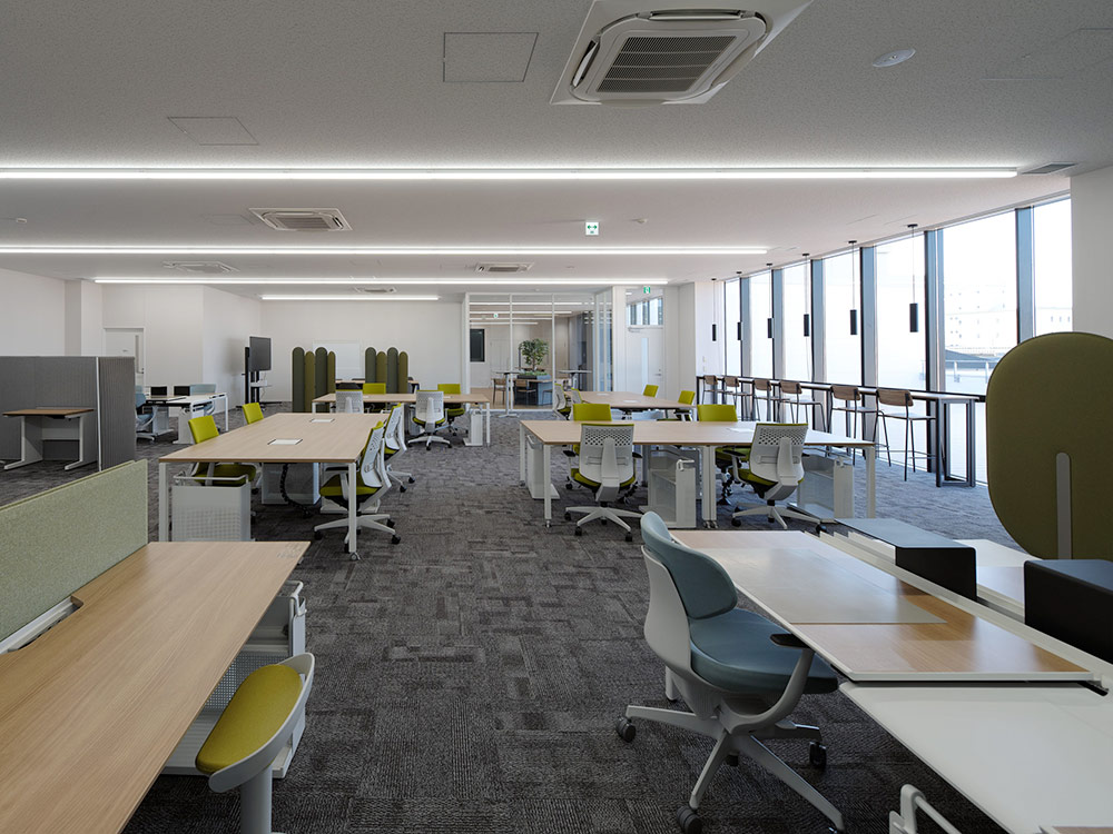 医薬品製造の品質管理基準に準拠した医薬品原材料生産とR&Dセンターの複合施設。動線ゾーニング計画と仕様で清浄度を確保しました。デッキテラスにつながるラウンジを設け、気軽な交流が生まれるワークプレイスを目指しました。