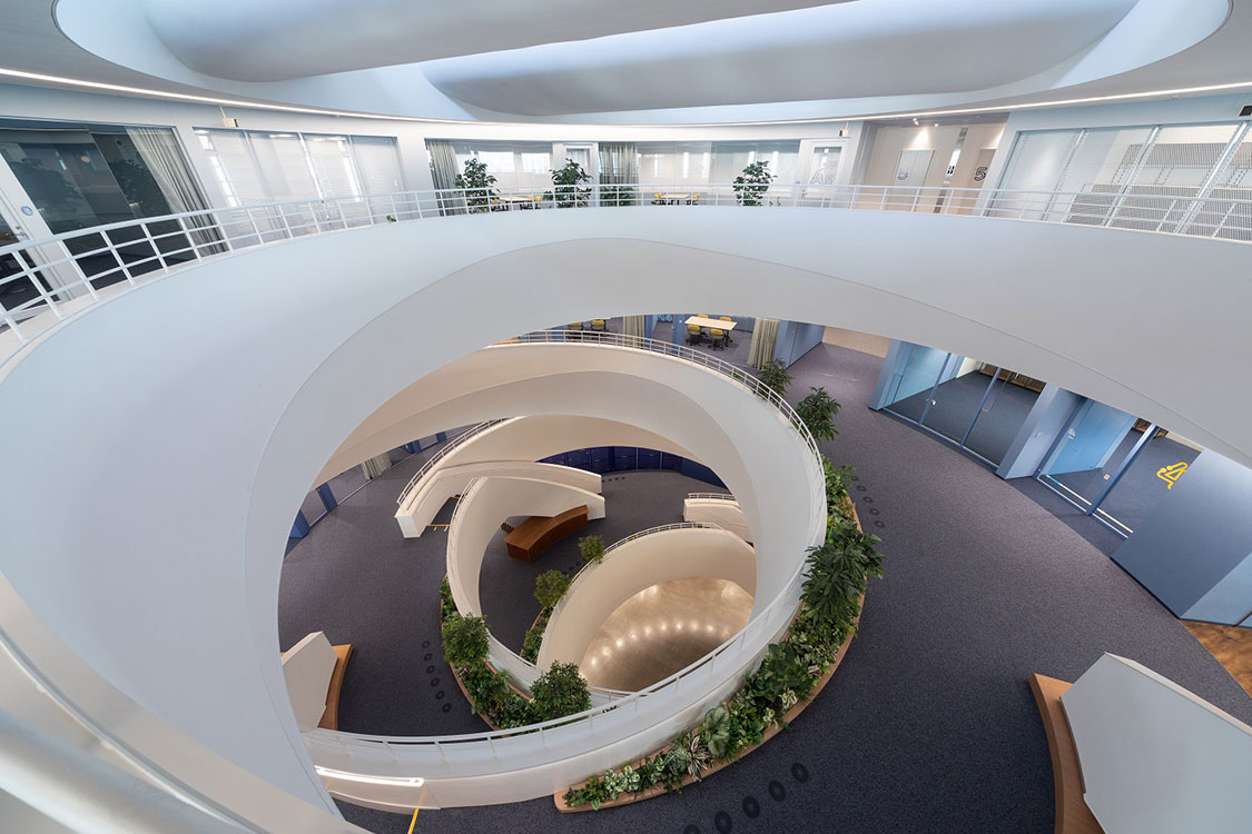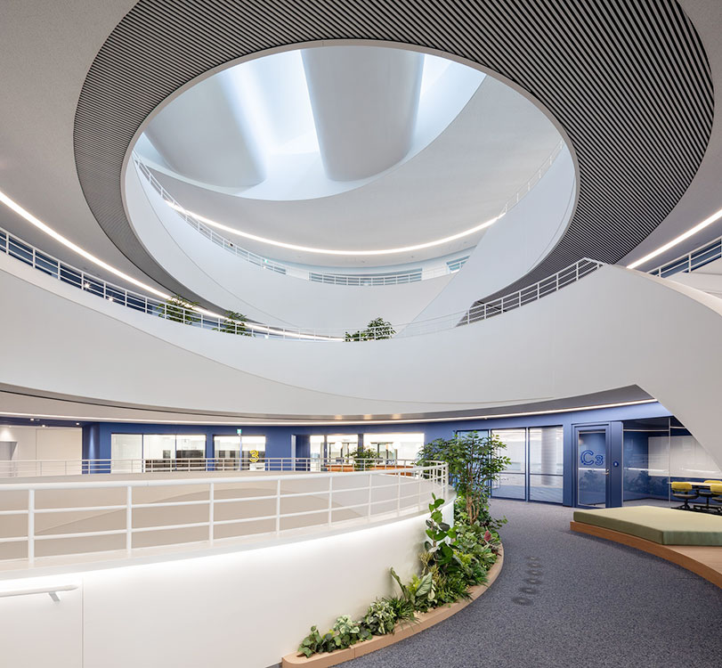 世界で活躍するお客様の研究、スポーツベットio つながらない機能を担うオフィス。フロアをずらして積層し、屋外テラスを設け、従業員と建物外部との節点を増やしました。建物内中央に社外と協働する吹抜空間を配置し、イノベーションの創出を意図しました。