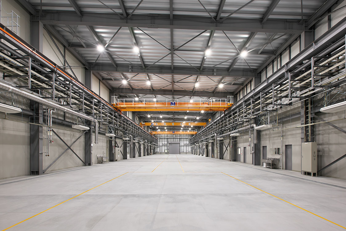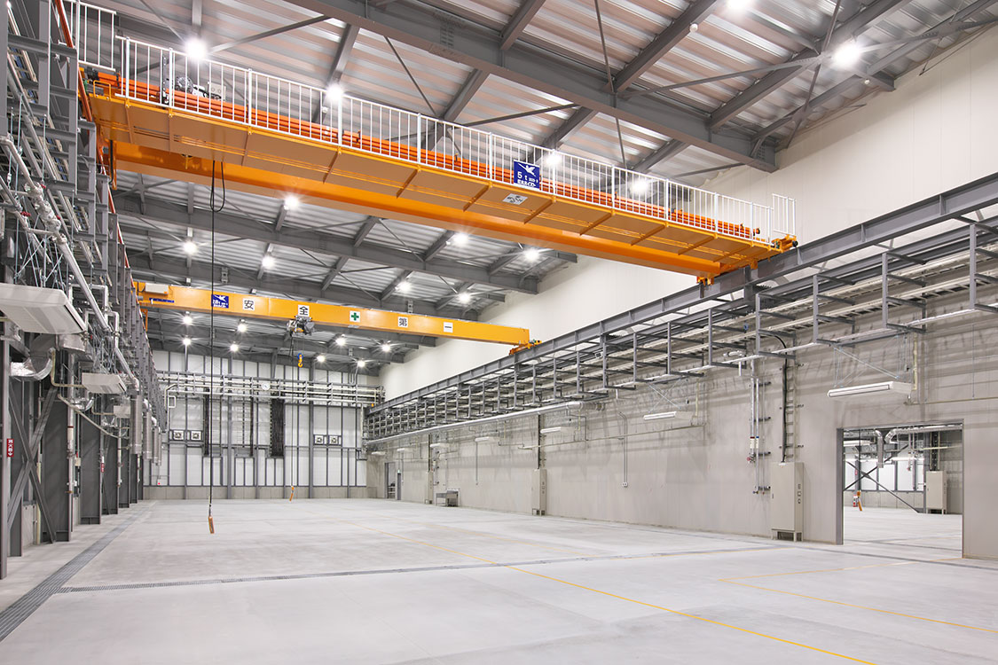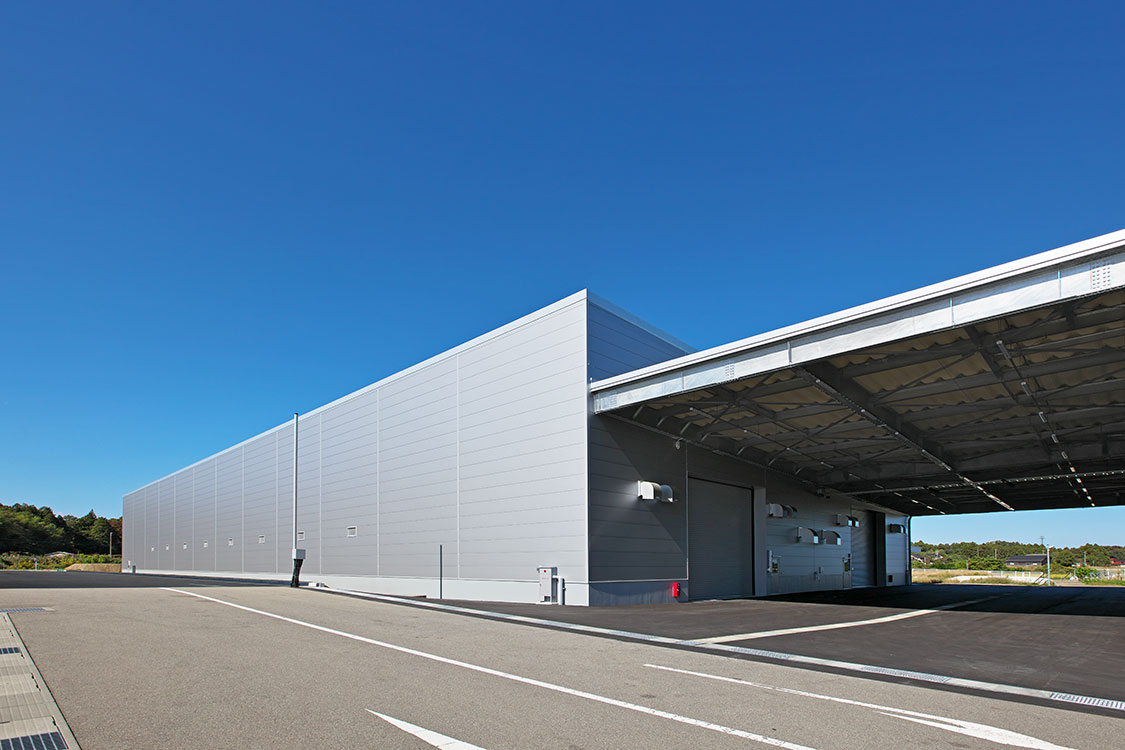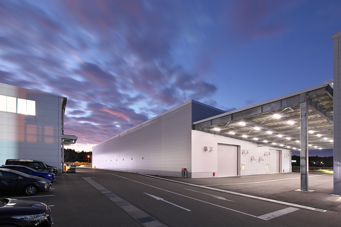 製麺機や米飯製造機の生産体制強化を目的とした工場の増設。全長80mの組立ライン2本が設置可能な巨大空間と事務所で構成されています。雨や雪の影響を受けないように、隣接する既存工場との間に約600m2の大屋根を設けました。