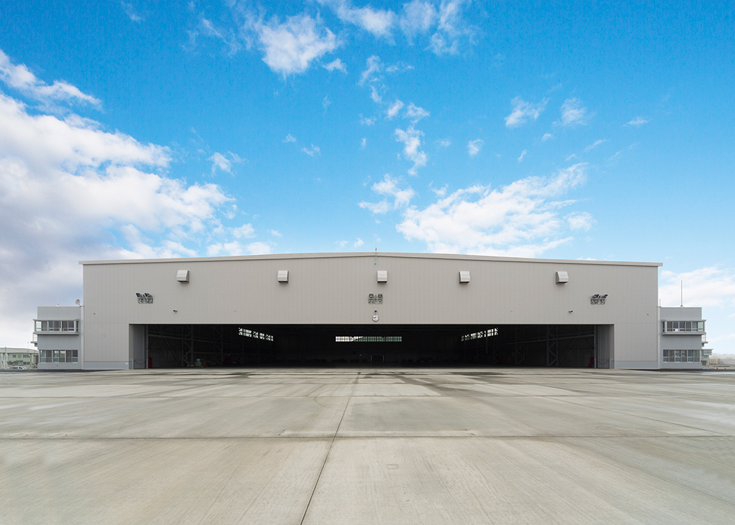 防衛局発注では当社初の設計施工案件を入札で受注。多数の戦闘機のスポーツベット 確実及び整備作業に耐え得る大空間や大扉を、本社専門部署と連携し、当社技術の※スーパーウィング構法を採用して実現しました。 ※プレストレスを導入した鉄骨トラスで大空間を構築する構工法