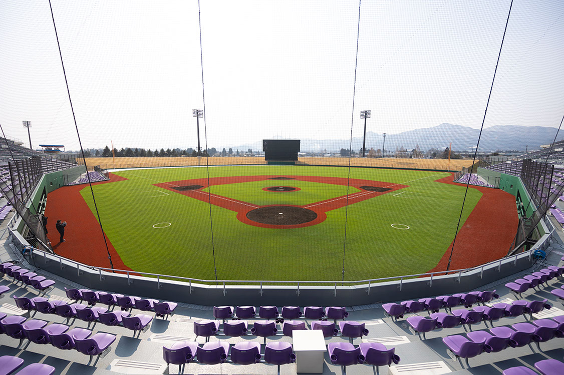 PFI事業である人工芝の新球場が完成。キッズスタジアムと野球場の整備では、東京2020大会で使用した木材を再利用しました。親しまれる市民球場として、当球場の利用者から新たなプロ野球選手が生まれることを期待しています。