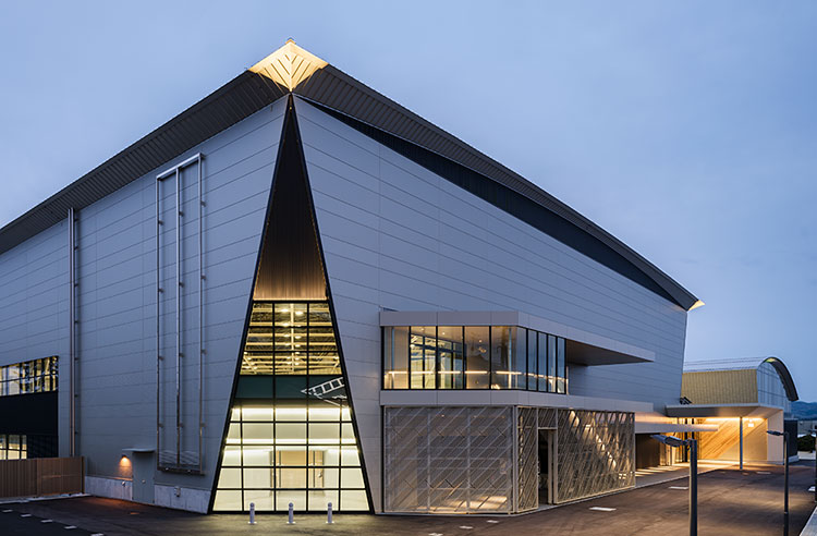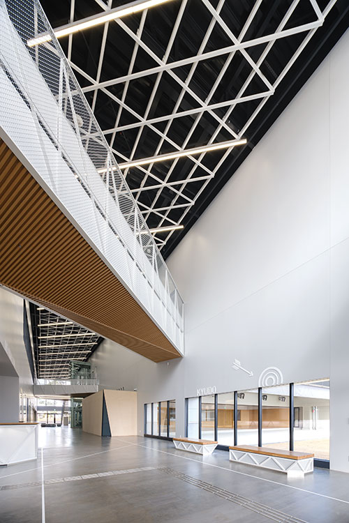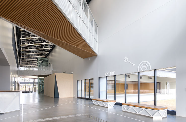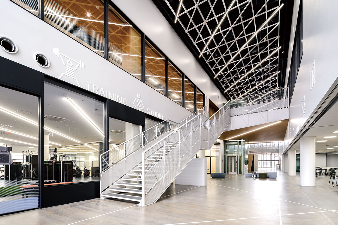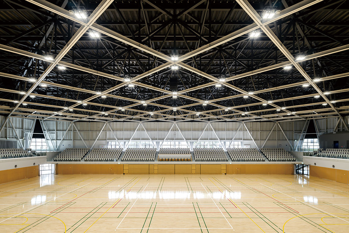 当建物は、「多様なアクティビティーと地域をつなぐアリーナ」をコンセプトに設計しました。南北のエントランスを結ぶ、通り抜け自由なスポーツモールを中央に配置。モールからさまざまな活動が見えるだけでなく、外からも見えるようにアリーナの四隅を三角形に切り取ってガラス窓とするなど、スポーツを身近に感じられる、地域に開かれた計画としました。市の基幹産業である繊維から発想した「紡ぐデザイン」で「スポーツベット 必勝掲示板らしさ」を演出。特にモールでは仕上げや造作家具に斜めのラインを用い、繊維が紡がれるさまをつくり込みました。設計時は、繊維会社との意見交換や中学生とのワークショップなど市民との共創活動を実施。オープニングイベントを楽しむ方々の様子に、公共施設を設計する喜びを感じました。