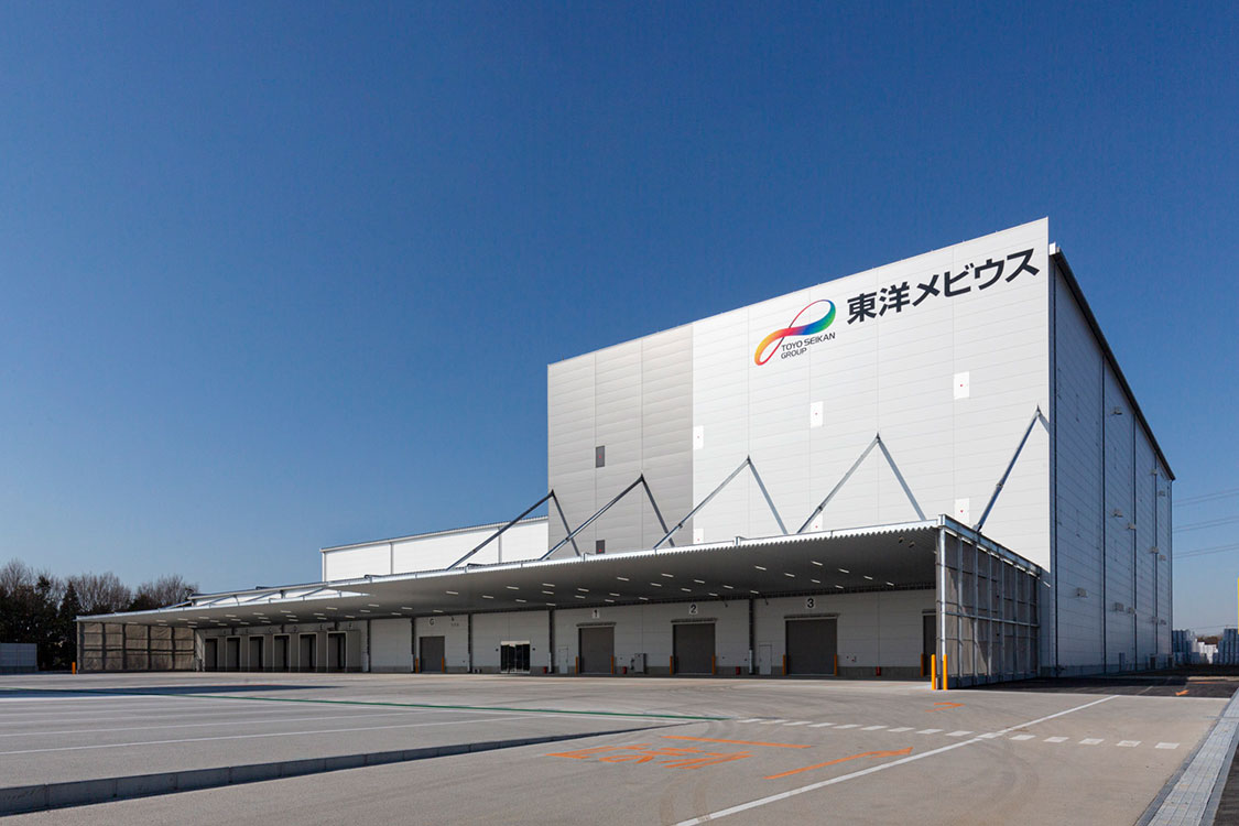 主に缶やペットボトルなどの飲料製品の容器を保管する倉庫。出幅20mの大庇が特徴的な堅固な建物とし、施設内は一般倉庫と自動ラック倉庫を併設して運用性に配慮しました。太陽光発電設備を設置してZEB認証を取得しました。