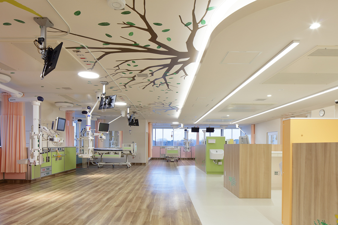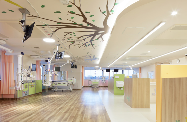 災害拠点病院としてさまざまなBCP対策を行い、市民の安全・安心の拠点となる病院を実現しました。さらに“Family-Centered Design”のコンセプトの下、患者とその家族の心に寄り添う温かみのある空間をつくり込みました。