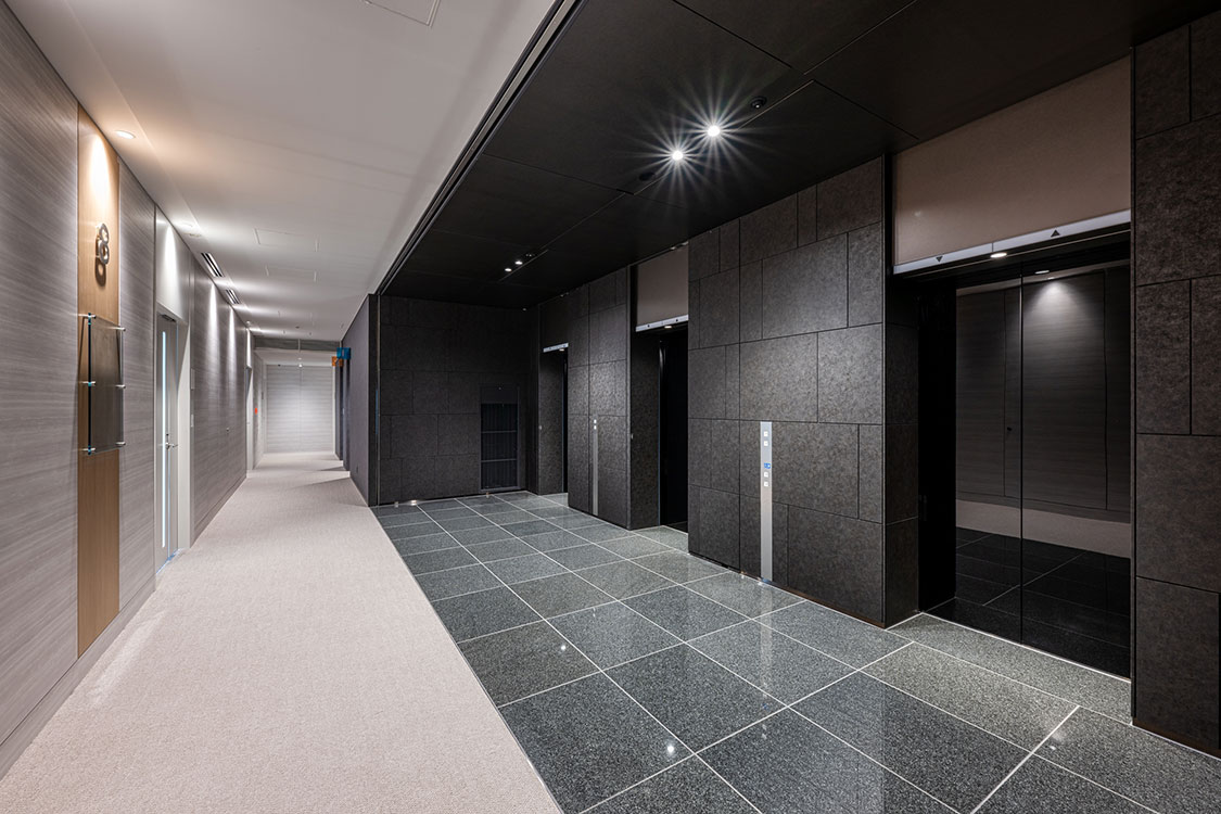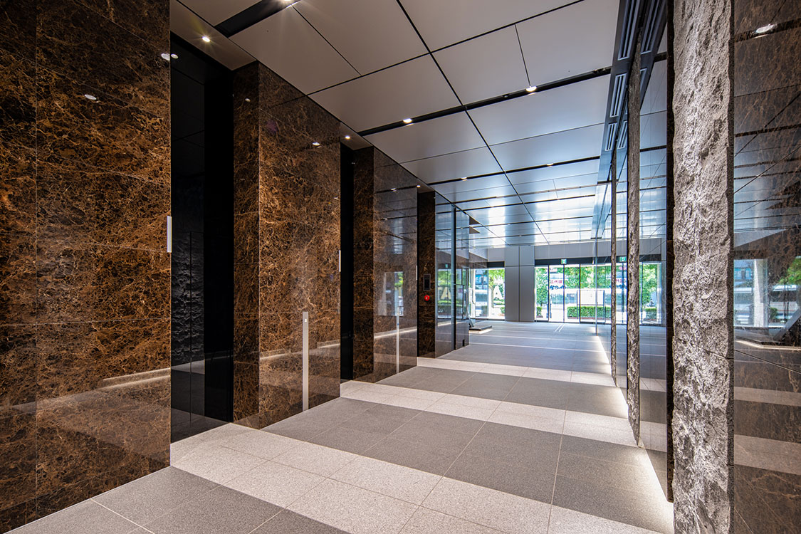 外観とエントランスに重厚感を持たせ、エレベーターホールに真壁石を採用したテナントオフィスベットネット スポーツ。2階に入居者用コワーキングスペースを設け、ベットネット スポーツの価値向上を図りました。