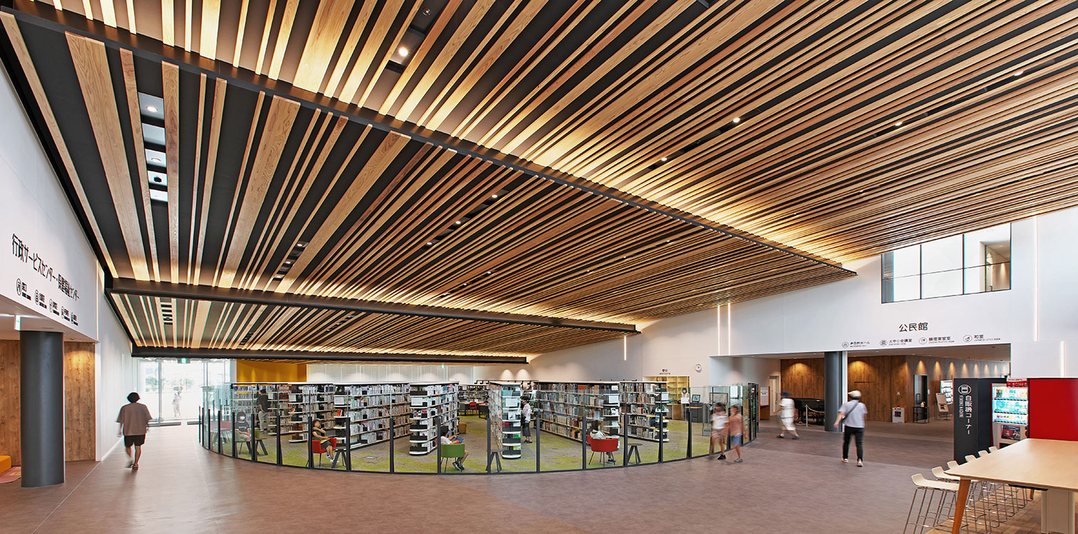 富山市のPFI事業による、図書館や多目的ホールなど多岐の用途に対応する複合施設。斜め天井や曲面ガラス壁、書架配置のスポーツベット 得する人では、VRなどのITツールを活用して三次元で説明を行い、お客様の合意を得ました。