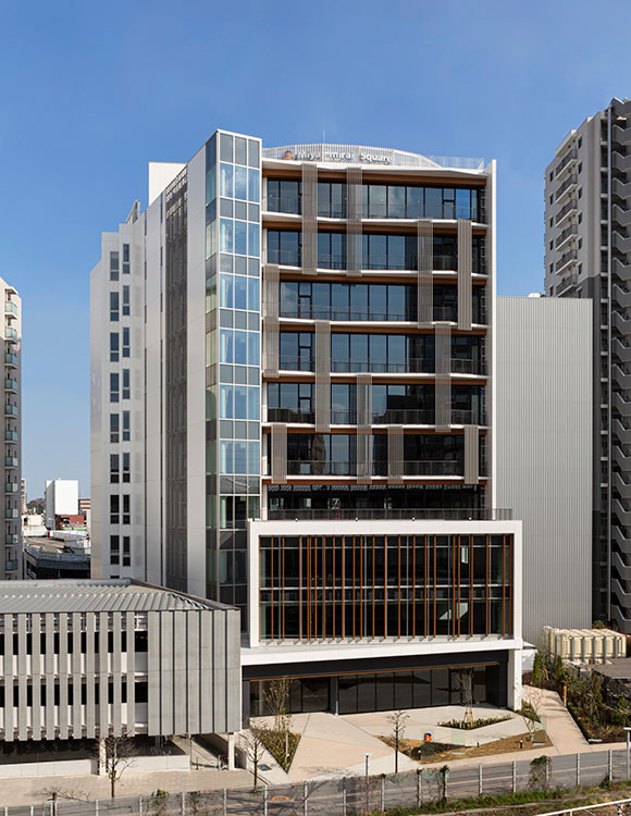 宇都宮駅前に立地するテナントオフィスビル。新幹線、在来線からの視認性が良く、お客様のフラッグシスポーツベットとはビルとなるデザインを意識しました。リフレッシュ空間、バルコニーを介して、人の動きが外から見える外観としました。
