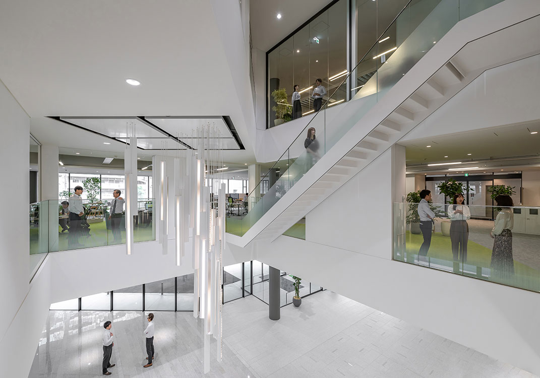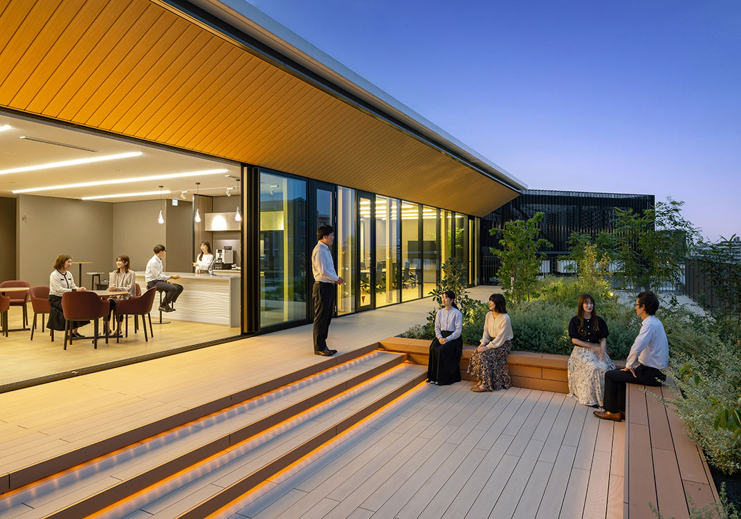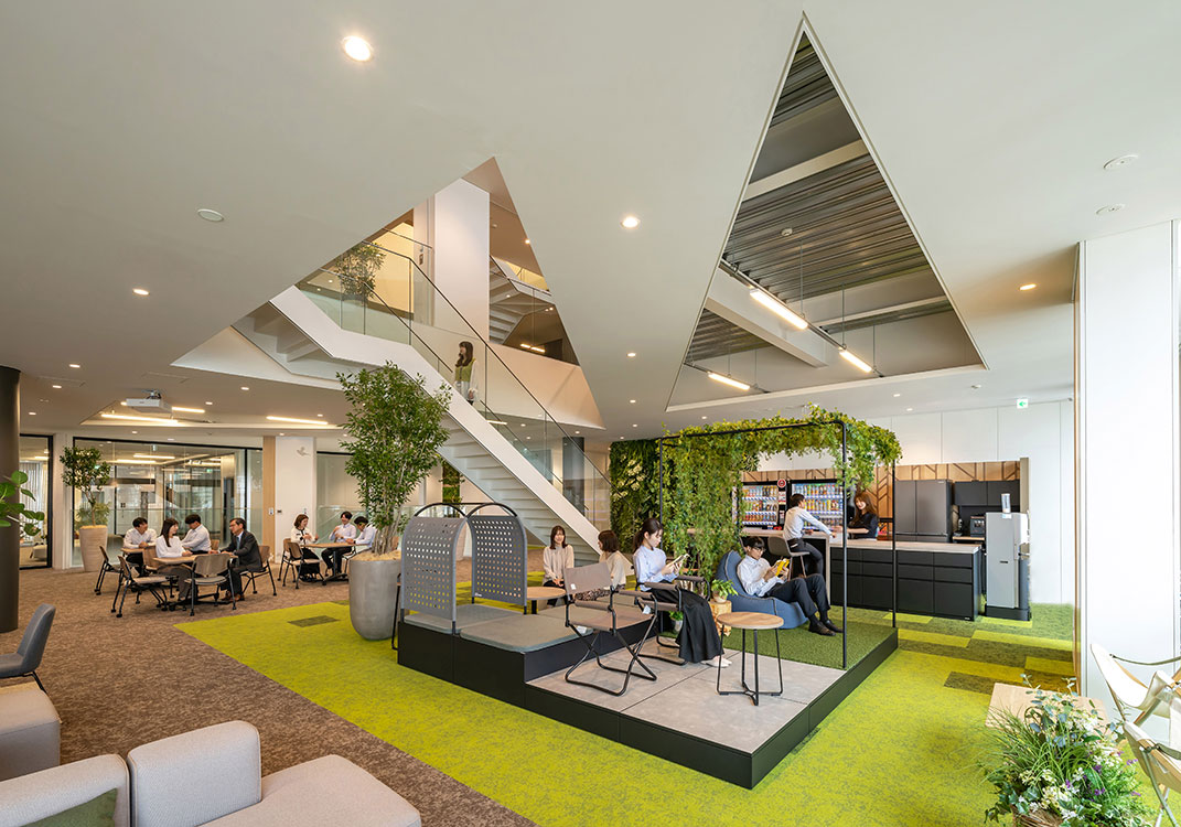 リビングのように集まりたくなる場所を目指したオフィス。従業員同士の出会いを生む階段のある吹き抜けを中心に、開放的な執務エリアと自然を感じられる屋上庭園、テラスを設けました。