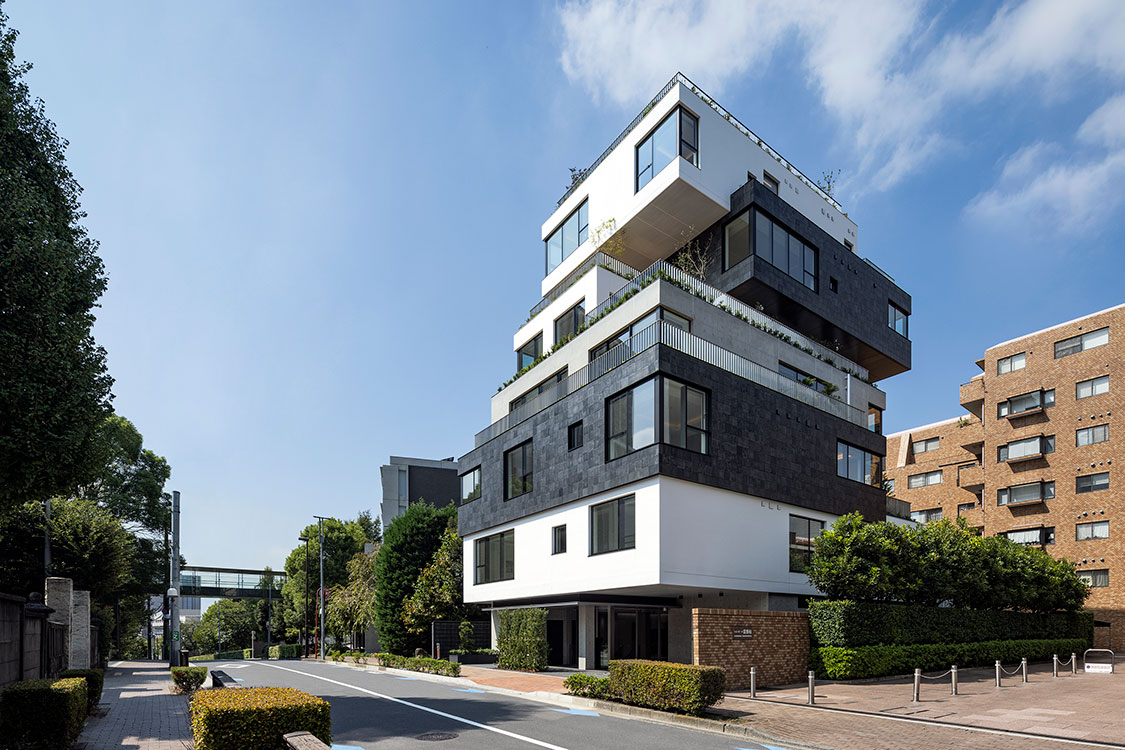 各層を凸凹にずらした建物形状と、高級感のある仕上げが特徴的な共同住宅。全フロアで平面プランが異なるため苦心しましたが、関係者一丸で取り組み、竣工させることができました。