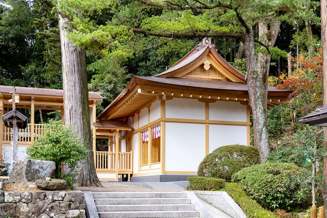 多⽤途に使⽤できる神饌所。緑豊かな境内、既存社殿との調和を考え、拝殿側に開けた総ヒノキ造りの清々しい外観としました。既存社殿と高床の渡り廊下でつなぎ、使い勝手も改善しました。