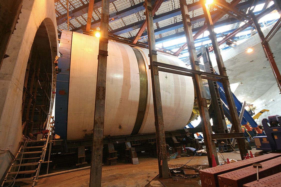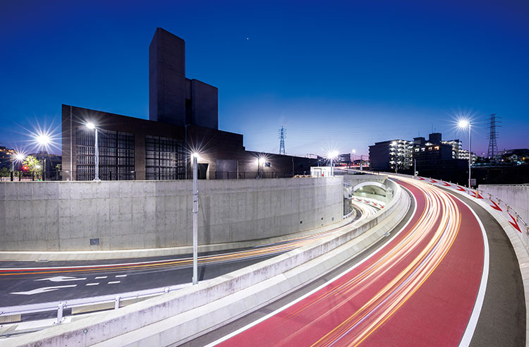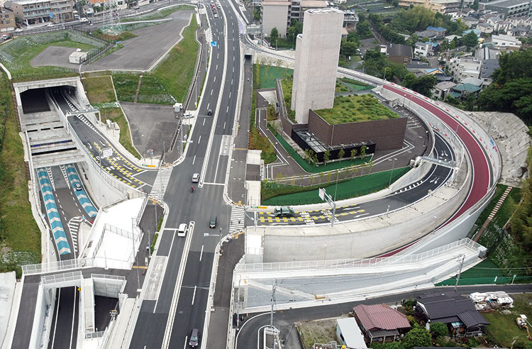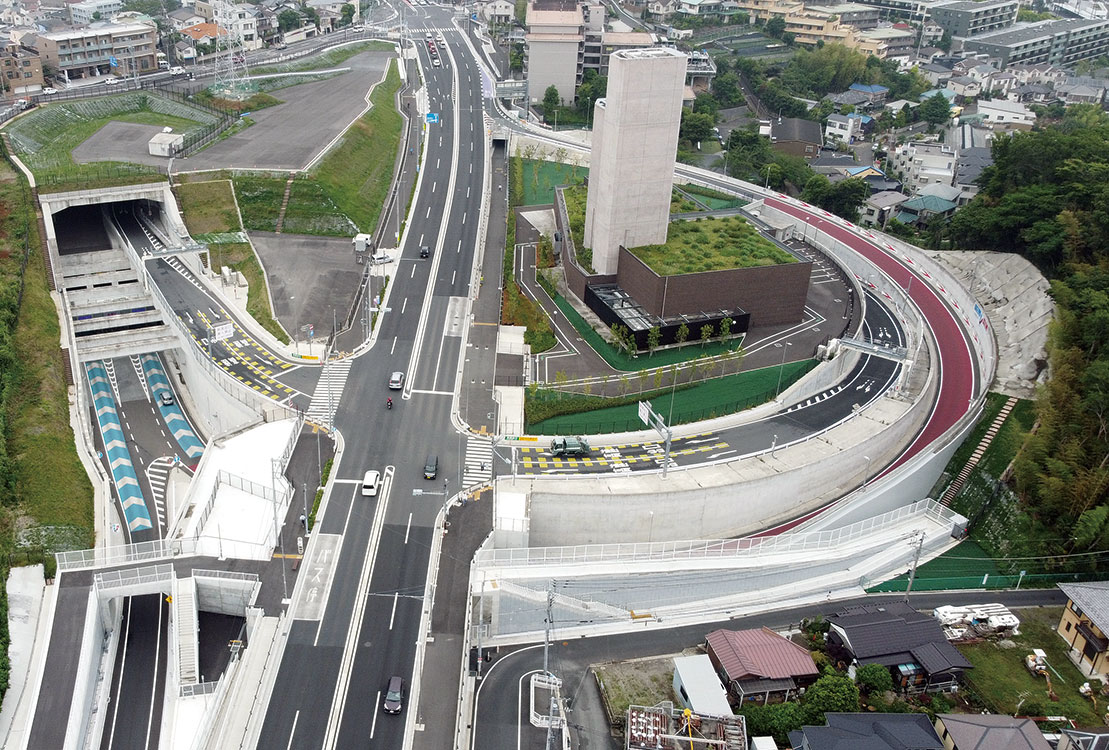 2017年3月に運用を開始したスポーツベットレビュー環状北線。当社が施工した馬場ランプ工事は、その中央に位置する場所に、市道と接続するランプ、換気所の地下部分を構築し、また、既存の県道の大田神奈川線を整備、拡幅するものです。2020年10月に全ランプが開通しました。当工事の最大の特徴は、4本の直径10m級大断面シールドトンネルの施工。最小土被り1.27m、曲線半径50mかつ下り7.6%という急曲線、急勾配でのシールド掘進は、当社としては前例のないものでした。手探り状態で始めた難度の高い工事でしたが、綿密な計画を立案し、各所と調整を行い無事に完遂しました。
